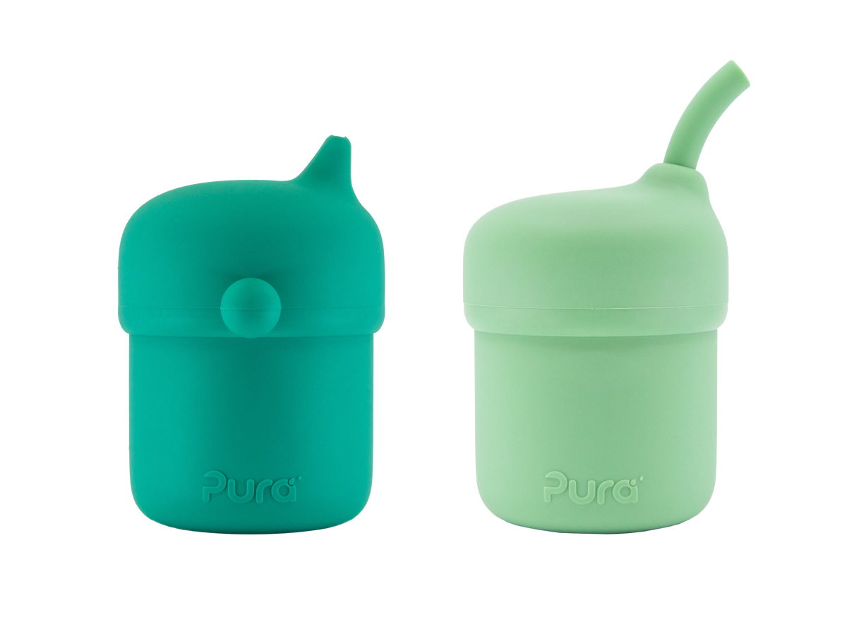Two 5oz Sippy Cups, Mint & Moss. Crafted from 100% Silicone. Includes tight-fitting, drinking tops and bases with integrated volume marks. 3m+